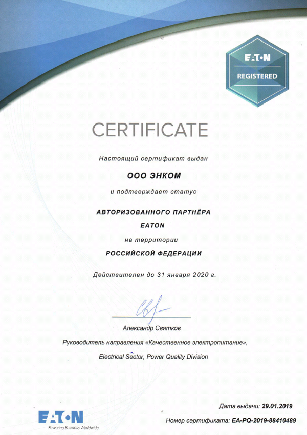 Сертификат авторизованного партнера EATON на 2019 год
