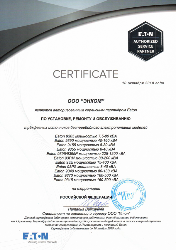 Сертификат авторизованного сервисного партнера EATON